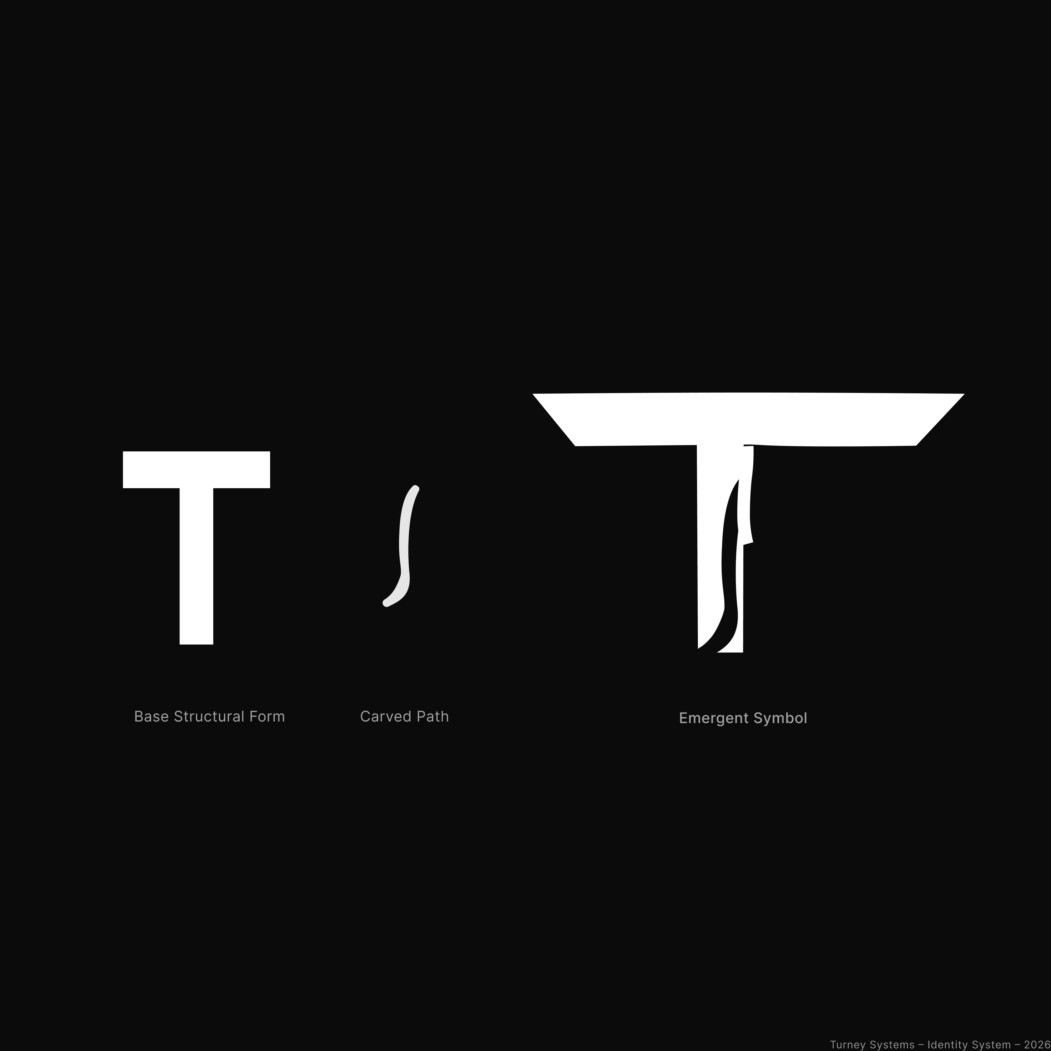 The S emerges directly from the structure of the T, representing systems developing from a clear and deliberate foundation. The form is intentionally restrained, allowing the symbol to function not only as a mark, but as a visual expression of the studio's belief that structure creates systems.